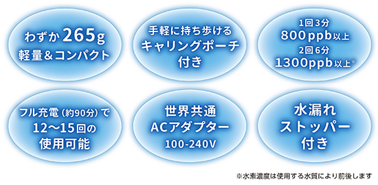 わずか3分で高濃度水素水を生成するmizucure(ミズキュア)。265gと軽量&水漏れストッパー付きなので、手軽に安心して持ち歩けます。いつでもどこでも出来立ての新鮮水素水を味わえます。
